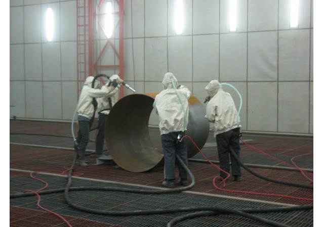 噴砂采用壓縮空氣為動(dòng)力,以形成高速噴射束將丸料(金金剛砂、鐵砂、鋼丸)高速噴射到需要處理的工件表面,使工件表面的外表面的外表或形狀發(fā)生變化,由于丸料對工件表面的沖擊和切削作用,使工件的表面獲得一定的清潔度和不同的粗糙度,使工件表面的機(jī)械性能得到改善,因此提高了工件的抗疲勞性,增加了它和涂層之間的附著力,延長了涂膜的耐久性,也有利于涂料的流平和裝飾。