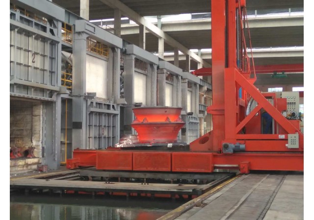 生產(chǎn)線配有一臺(tái)快速下水(油)淬火操作車,該操作車可上下、左右、前后六個(gè)方向移動(dòng)。工件熱處理完成后,操作車迅速進(jìn)入爐內(nèi)將工件從爐膛內(nèi)叉出,并快速落入水池或淬火液池內(nèi),整個(gè)轉(zhuǎn)移過程可控制在30秒內(nèi)完成。